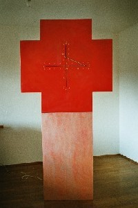 Wie bei der Zeit-Geraden bewegen sich die Zeit-Anzeiger auf Linien nichtlinear vorwärts. Wenn der eine Zeiger zur Ruhe kommt muß sich der andere Zeiger sputen: Der Wechsel von Ruhe und Dynamik bestimmt den Zeitlauf der Welt. Die Uhr wurde für die Kunstausstellung "Kreuz-Zeichen "